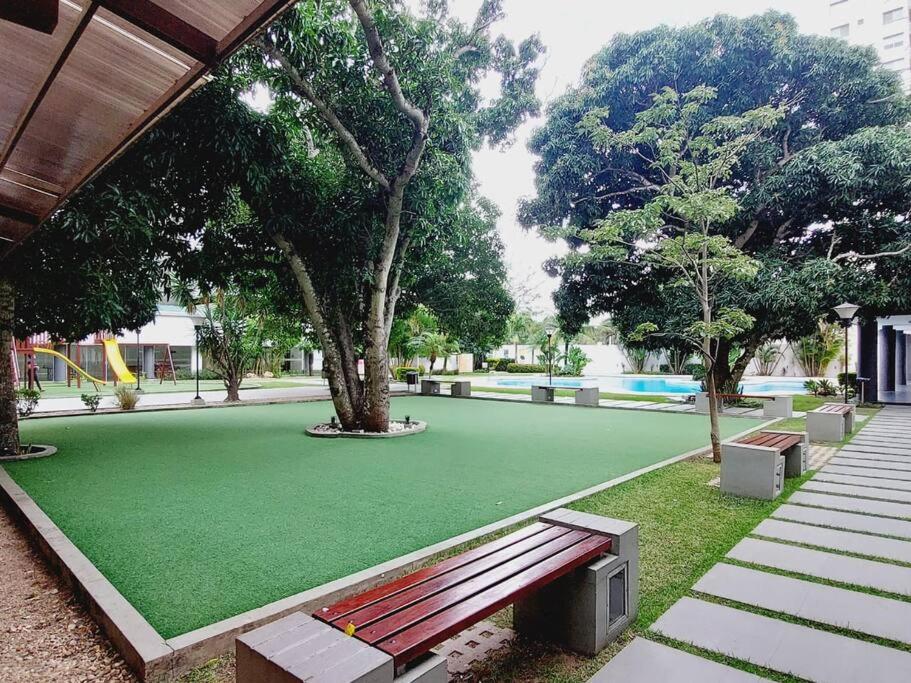 Hay una piscina disponible en el establecimiento de Amplio y comodo departamento.